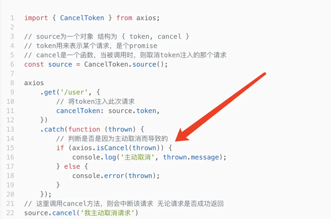 我们就在axios请求在catch中通过isCancel方法判断这个异常是不是取消请求抛出来的,也就是判断他是不是Cancel实例, 从而做相应处理。