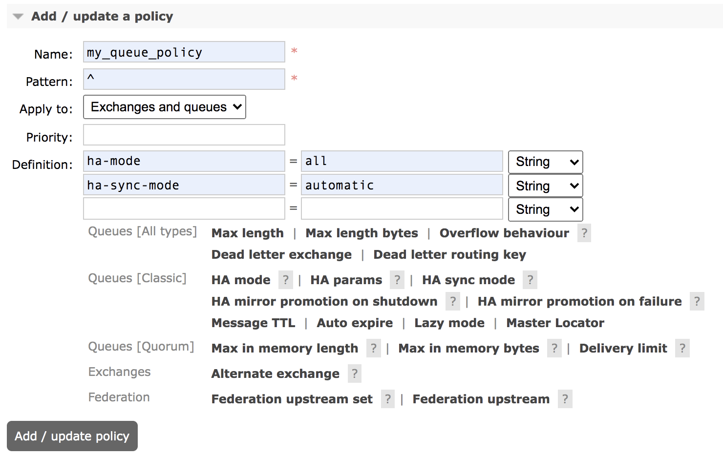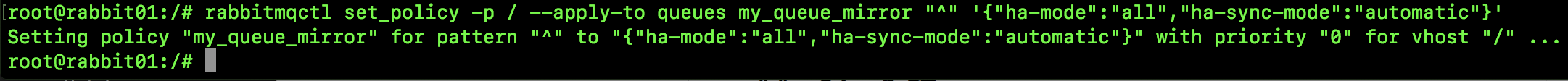 rabbitmqctl set_policy -p / --apply-to queues my_queue_mirror "^" '{"ha-mode":"all","ha-sync-mode":"automatic"}'