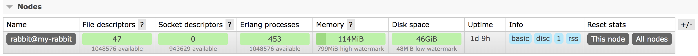 - RAM node:内存节点将所有的队列、交换机、绑定、用户、权限和 vhost 的元数据定义存储在内存中,好处是可以使得交换机和队列声明等操作速度更快。