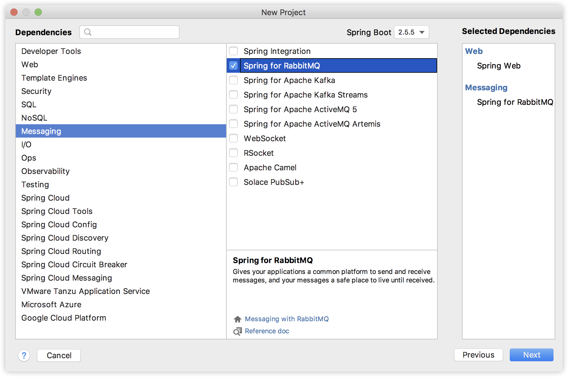 第一个子工程名为 provider,是一个消息生产者,创建时引入 Web 和 RabbitMQ 依赖,如下: