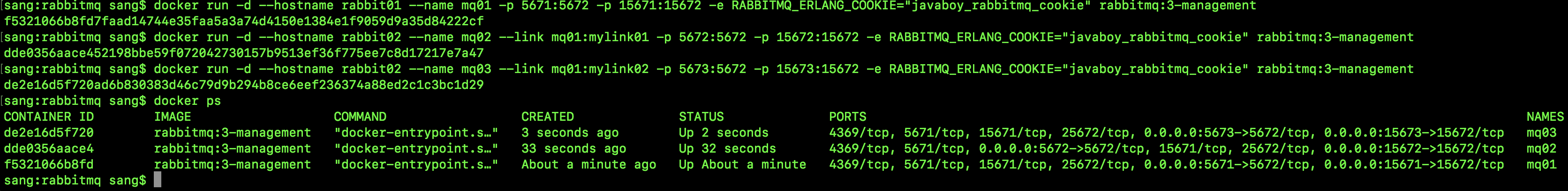 docker run -d --hostname rabbit03 --name mq03 --link mq01:mylink02 --link mq02:mylink03 -p 5673:5672 -p 15673:15672 -e RABBITMQ_ERLANG_COOKIE="javaboy_rabbitmq_cookie" rabbitmq:3-management