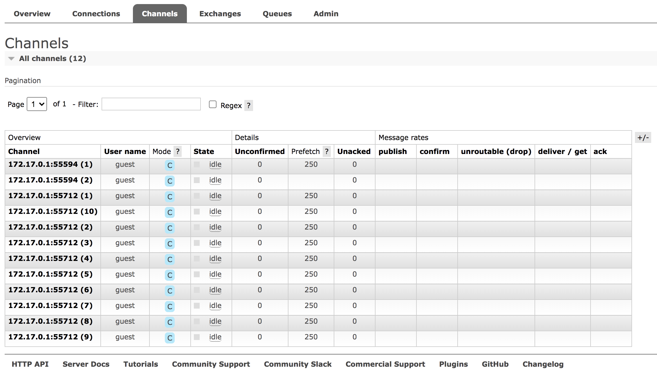 - Channel: 如果每一次访问 RabbitMQ 都建立一个 Connection,在消息量大的时候建立 TCP Connection 的开销将是巨大的,效率也较低。Channel 是在 Connection 内部建立的逻辑连接,如果应用程序支持多线程,通常每个 Thread 创建单独的 Channel 进行通讯,AMQP method 包含了 Channel id 帮助客户端和 Message Broker 识别 Channel,所以 Channel 之间是完全隔离的。Channel 作为轻量级的 Connection 极大减少了操作系统建立 TCP Connection 的开销,关于 Channel,松哥在RabbitMQ 管理页面该如何使用一文中也做过详细介绍。