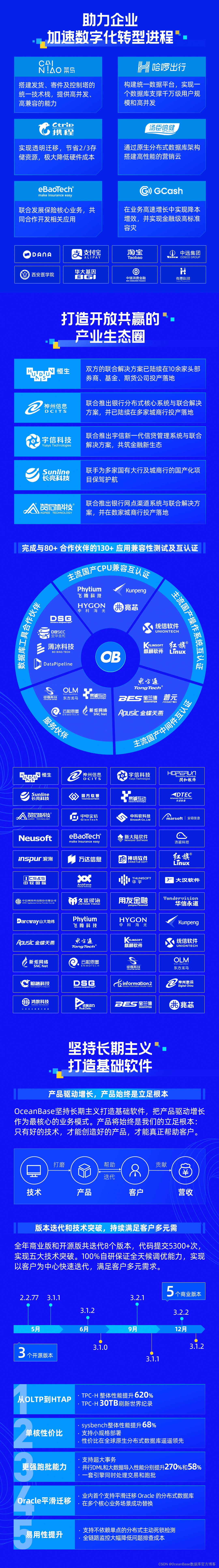 作为企业级原生分布式数据库代表,OceanBase 在过去一年中深耕核心金融场景,目前全国1/4的头部金融客户将 OceanBase 作为核心系统的升级首选。也就是说国内200多家头部银行、保险、证券、基金公司中,50多家都是OceanBase 的客户。而在区域性的银行、保险、证券及基金公司中,OceanBase 市场占比行业第一。