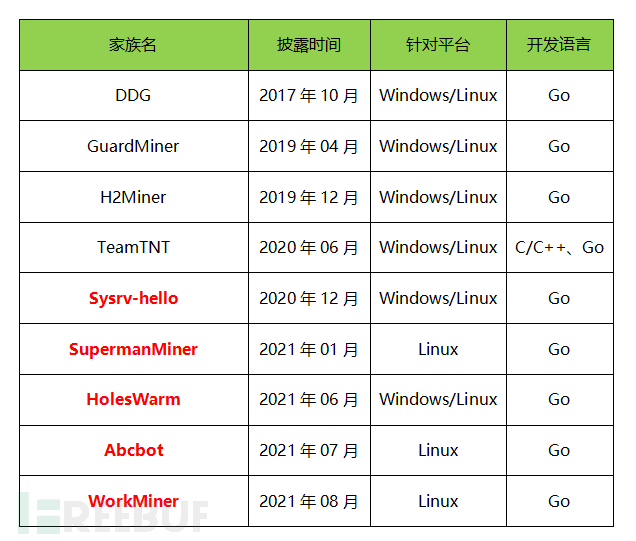 Go语言受挖矿木马团伙青睐的主要原因是挖矿木马为了收益最大化,往往会跨平台传播,而Go语言的特性便是支持跨平台编译。这样就允许恶意软件开发人员只需维护一套代码,就能针对不同操作系统编译出对应的恶意软件,可以减少开发周期和维护成本;并且Go语言又如Python一样,拥有丰富的第三方库,降低了开发难度,提升了开发效率。因此使用Go语言开发恶意挖矿木马已成为一种趋势,近几年使用Go语言开发的挖矿家族如下: