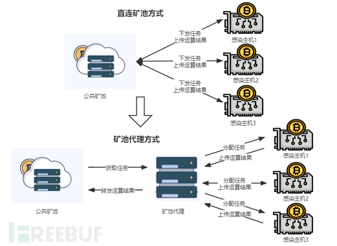 挖矿木马常见的挖矿方式为受害主机直连公共矿池贡献算力,矿池平台根据贡献的算力,再将收益支付给挖矿木马团伙。然而近几年,这种方式也正在发生改变,越来越多的挖矿家族开始使用矿池代理的方式来进行挖矿。如Sysrv-hello、HolesWarm、MimuMiner等家族都已使用矿池代理的方式进行挖矿。