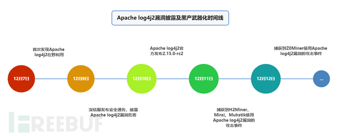 每当爆发影响范围广泛的漏洞后,全网受影响的设备很难在短时间内得到有效的修复。一些“嗅觉”敏锐的挖矿团伙会立刻集成漏洞发起攻击。例如近期Log4j2漏洞爆发事件中,**H2Miner、Muhstik等挖矿家族在距Log4j2漏洞披露不到36小时,便已集成该漏洞并发起攻击。**这对企业的漏洞快速修复能力构成了严峻考验,一旦企业没有及时进行修复,挖矿木马团伙便能轻松获得主机的控制权,Log4j2漏洞披露及各恶意家族武器化的时间线如下:
