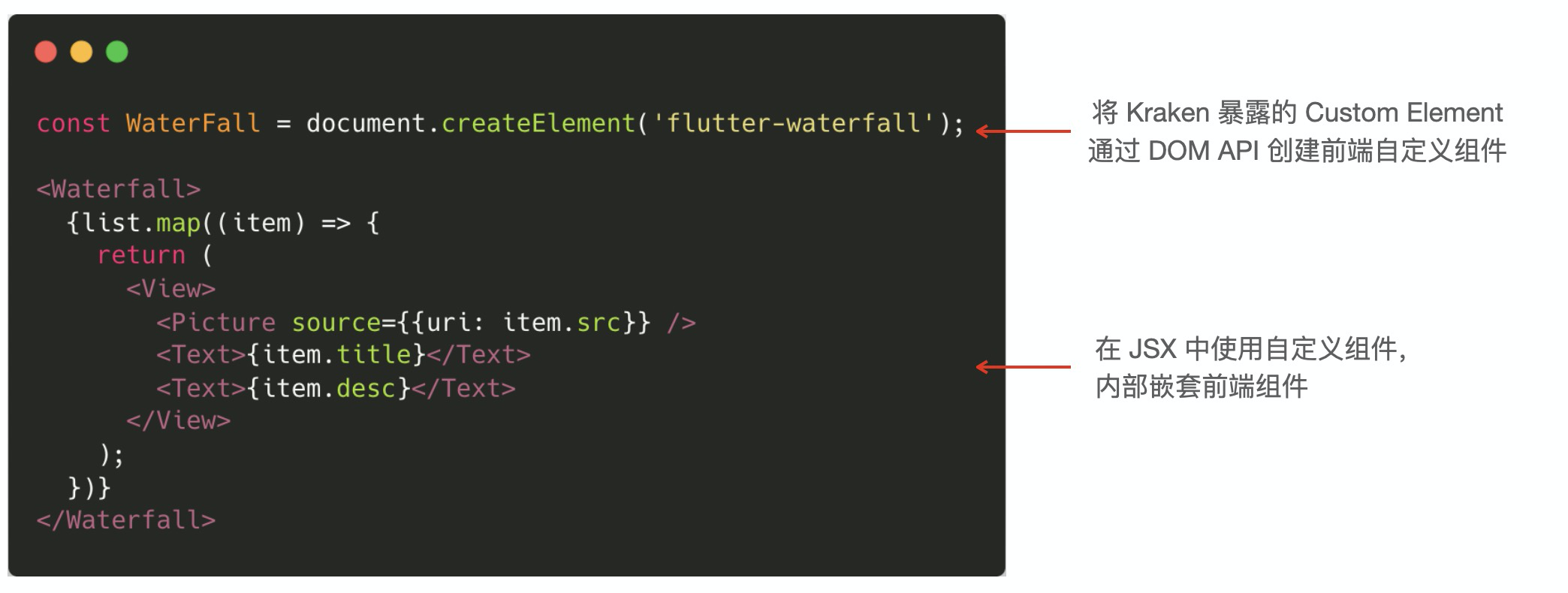 - 在前端通过标准的 DOM API 创建自定义组件,然后在 JSX 中使用。