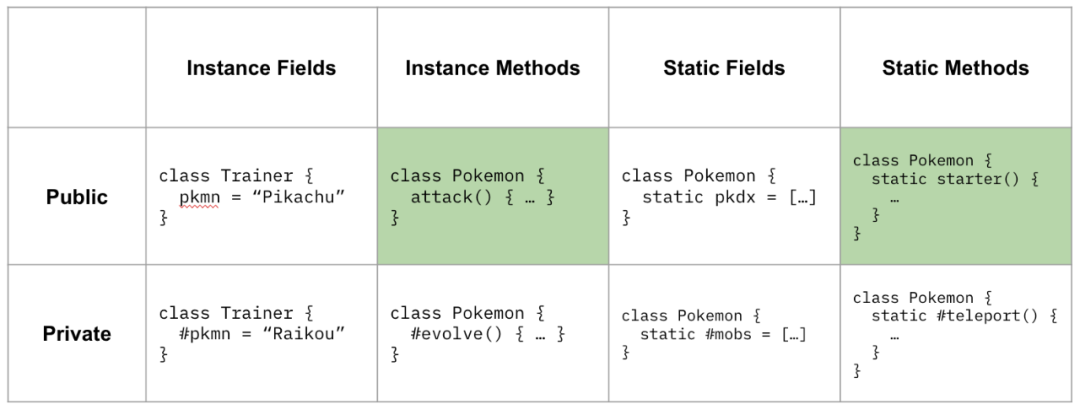 提案为 ECMAScript Class 新增了下表中所描述的特性(绿色为现有特性):
