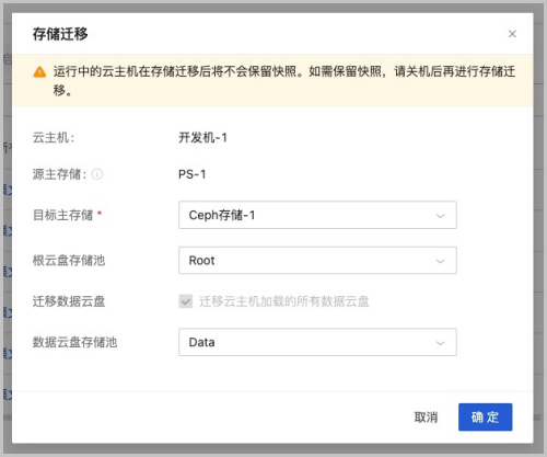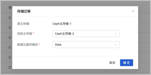 从ZStack Cloud 4.3.12开始,对云主机/云盘执行存储迁移操作时,若目标主存储为Ceph主存储,支持指定目标存储池(根云盘存储池、数据云盘存储池),满足用户对存储池的灵活分配需求。