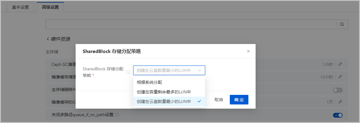 ZStack Cloud 4.3.12针对SharedBlock主存储多LUN场景提供存储分配策略优化。在全局设置中,新增 “SharedBlock存储分配策略”,用于设置云盘和快照在SharedBlock主存储 LUN上的落盘策略。策略主要包括三种:根据系统分配、创建在容量剩余最多的LUN中、创建在 LV(快照+云盘)数量最少的LUN中。
