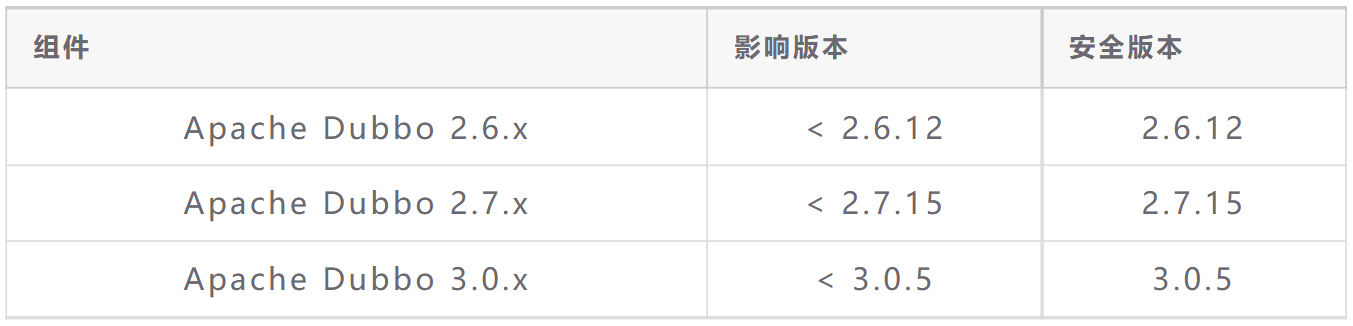 根据影响版本中的信息,排查并升级到安全版本。下载链接:https://github.com/apache/dubbo/releases