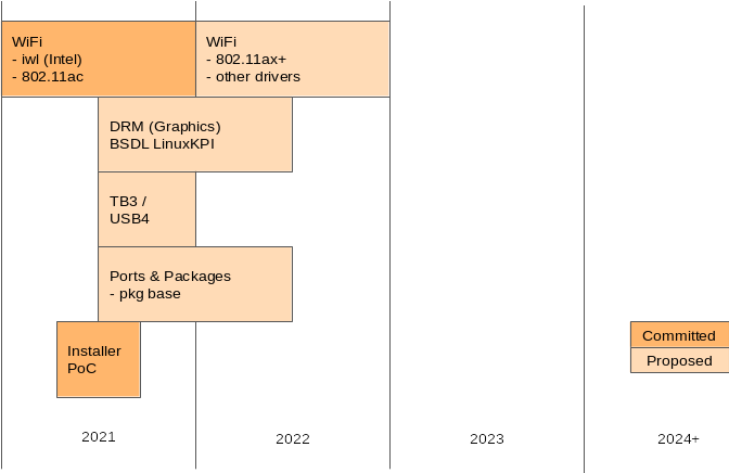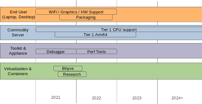 根据从个人和商业用户收集到的意见以及市场趋势,FreeBSD 基金会制定了一份时间跨度近 5 年的技术路线图 (Technology Roadmap),主要囊括四个方面:
