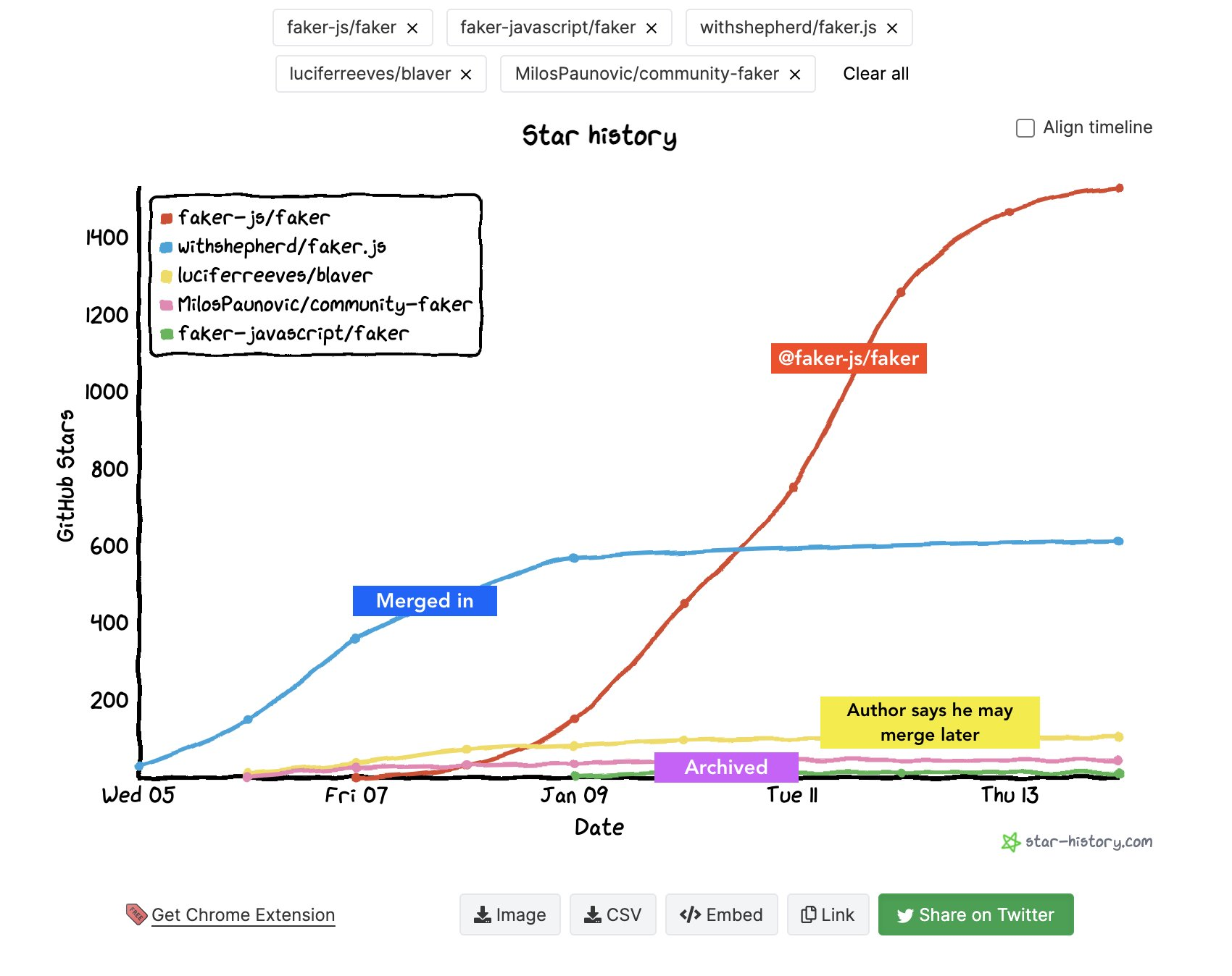 从项目仓库的 star 数增长情况来看,由社区控制的 Faker.js 项目已获得了不少开发者的认可。