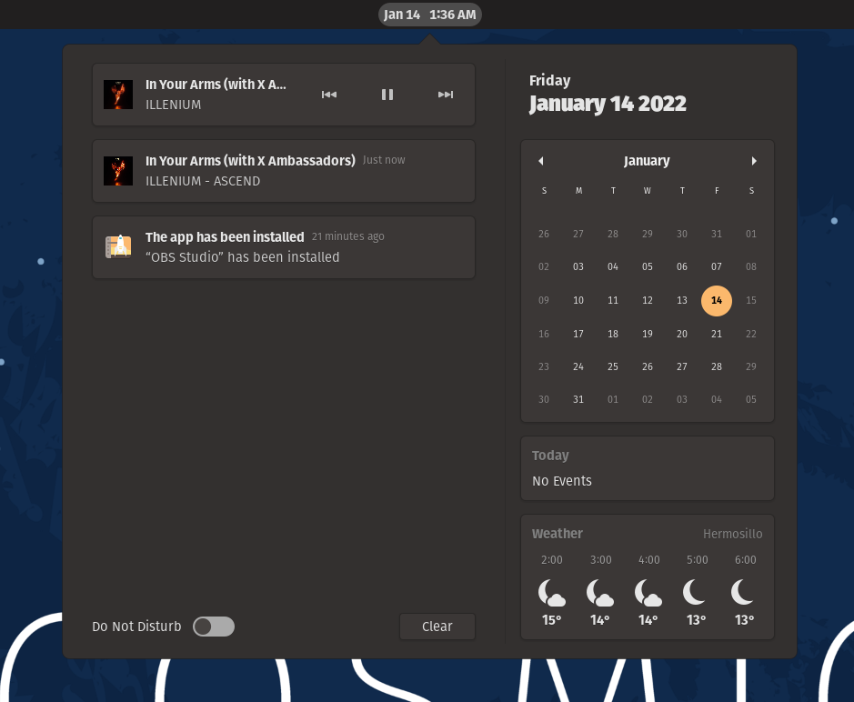 目前用户还不能点击触发 Workspaces或Applications,但能够在点击日期按钮时显示日历和媒体控件,而且这两个都能正常使用。