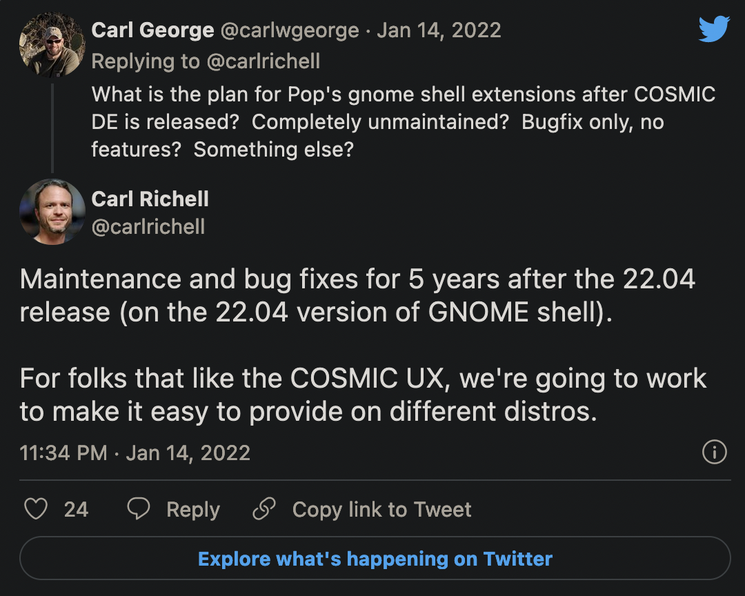 对于那些担心 Pop GNOME 的用户,Carl 则表示在 Pop!_OS 22.04 发布后的 5 年内都有维护和错误修复的计划。
