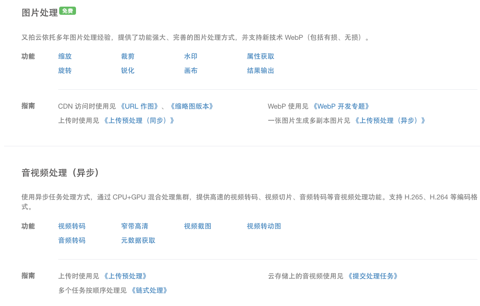 不单单是这些,使用又拍云上传媒体资源时还可以指定云处理参数进行图片视频预处理,上传完成后也可以进行水印,视频转码等一系列后续图片操作。而且这些图片处理功能都是免费的,赶快来试试这些的强大功能吧。