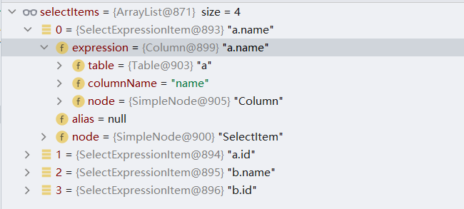可以发现在joins的元素中和fromItem对象中都存在Table类型的数据,通过Table类型可以从中获取表名,具体获取代码如下。
