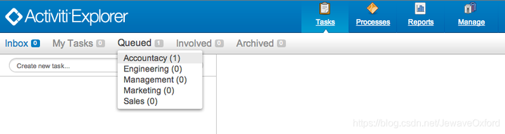 - 因为配置的ProcessEngine使用了与demo相同的数据,可以登录到Activiti Explorer.默认,accountancy(会计)组里没有任何人: