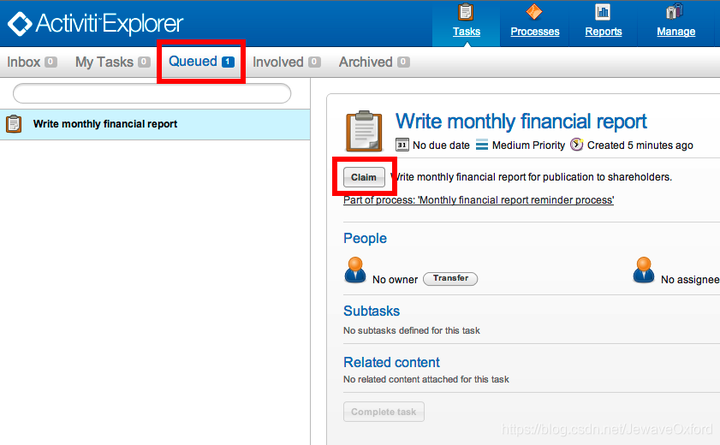 - 在Activiti Explorer UI中,点击认领按钮,会执行相同的操作.任务会移动到登录用户的个人任务列表.你也会看到任务的执行人已经变成当前登陆的用户: