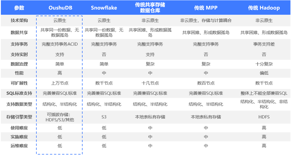 在这一架构中,偶数科技通过自研的新一代存算分离架构产品,实践湖仓一体2.0理念。其中核心技术亮点众多。包括功能强大的基于代价的优化器,实现系统自动选择最优执行计划;可充分利用最新CPU特性SIMD单指令多数据流,能做到指令内并行的新一代执行器引擎;多级资源队列,可通过DDL方便地定义和修改资源队列;原生Magma存储引擎与S3、HDFS混合使用,解决高性能与低成本的存储问题;多种优化存储格式,包括AO、Parquet、ORC等等。下图简单对比了包括Snowflake、偶数科技产品与传统数仓产品。