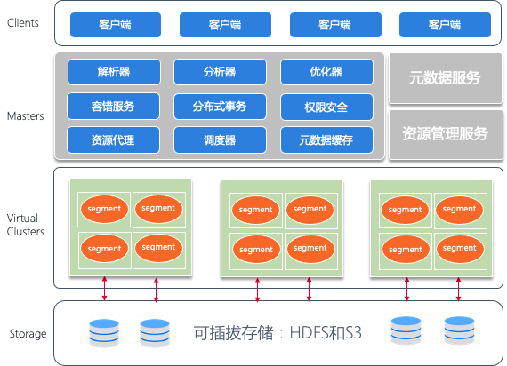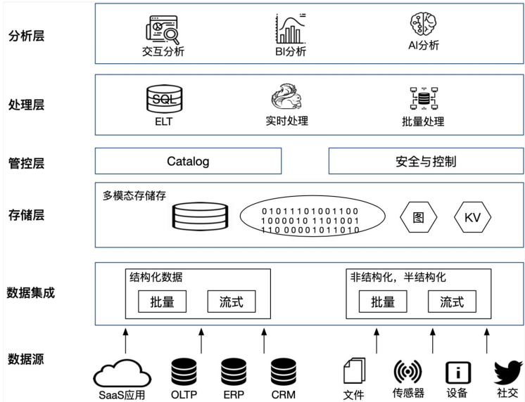 为了解决湖仓一体1.0的诸多问题,2.0应运而生。目前这一架构还在快速发展之中,尚无明确统一的技术框架。总的来说,可按照上图划分多层次,并在每层解决对应问题。从底层数据源,需对接多种数据源(包括结构化、半结构化及非结构化数据)。之上的数据集成需提供针对不同特征数据的集成能力(包括批量、流式)。处理过后的数据放入统一存储层,为面对不同结构的数据,需提供多模态存储能力,甚至为满足性能要求提供不同存储引擎。再之上是统一的元数据、安全、管控层,通过对全局数据的完整视角管理。为满足不同加工需求的统一处理层,层内提供多种加工能力。最上面是数据应用层。从技术上看,云原生数据仓库,为湖仓一体2.0提供有利支持,其技术上天然具备的存算分离、弹性扩展、多租户、可插拔存储、多计算引擎、分级资源管理等众多特性可满足上述要求。功能上兼具数据仓库的标准SQL、ACID能力,数据湖的大规模原始数据存储等。对上提供多种接入方式,包括标准数据库接入方式,支持高并发读写;对下支持多云、混合云及跨云部署,防止厂商绑定。其技术架构可简化为类似如下架构: