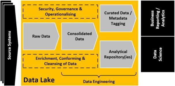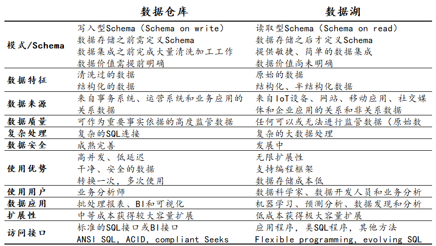Data Lake,是在2011年由James Dixon提出,其与数据仓库的主要区别在于数据仓库中数据在进入仓库之前是需要实现归类,而数据库是把大量原始数据通过廉价存储保存下来。数据仓库具有高度结构化的架构,用户可直接获得分析数据;而数据湖是将数据直接加载到湖中,然后根据分析的需求再转换数据。数据湖架构的特点可总结为:低成本、原始数据、需灵活可使用、面向任务数据绑定、不提前定义数据模型。在实现技术上面,多采用基于Hadoop生态的产品,兼具有MPP、Hive/Spark、NoSQL、Stream/Batch能力。具备良好的扩展能力,可支持数千节点的超大规模集群。但对SQL支持偏弱、ACID特性支持差,较难从传统数据仓库迁移过来。业务上更为强调数据资产管理与数据服务。