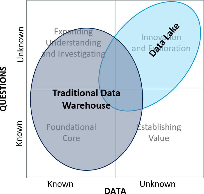 这里我们对数据仓库和数据湖做个简单对比,可以看出两者差异很多。基本上属于互补关系,各有其适合覆盖场景。前者更多是解决固定的、明确的数据问题;后者则为应对随机性、探索式的数据问题。下图可以更为准确的描述两者差异。