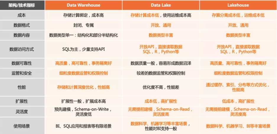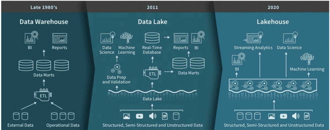 提到湖仓一体,就不得不从上世纪80年代说起。 当时市场还是数据仓库的天下,主要用来处理BI、仪表盘、报表等结构化数据,用于分析企业的内部的业务数据。 这种状态一直持续到2010年前后,越来越多企业产生对语音、视频等数据的处理分析需求,非结构化数据、半结构化数据的增长促使企业提升了高多样性,高速度和高容量的数据分析要求,数据仓库慢慢不能满足用户的需求。 随着数据仓库局限性的逐步显现,数据湖的概念也随之衍生出来,它能够存储各式各样的原始数据,解决了数据仓库的局限性。 但相比于优势来讲,湖的短板也同样明显,比如不支持事务,SQL性能差,无法支撑报表需求。 虽然数据湖和数据仓都各自有各自的优势和不足,但不难发现,二者在某些层面是非常互补的。 于是乎,是否有一种能兼具两者优点的架构出现,于是诞生了“湖仓一体”。