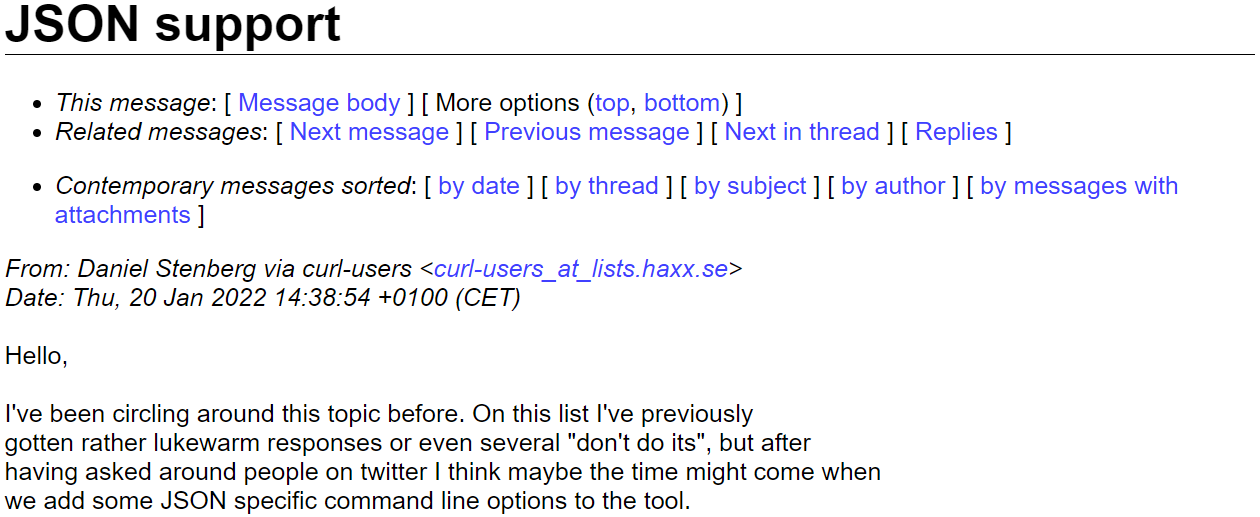 Daniel 解释了为 cURL 添加原生支持 JSON 的理由: