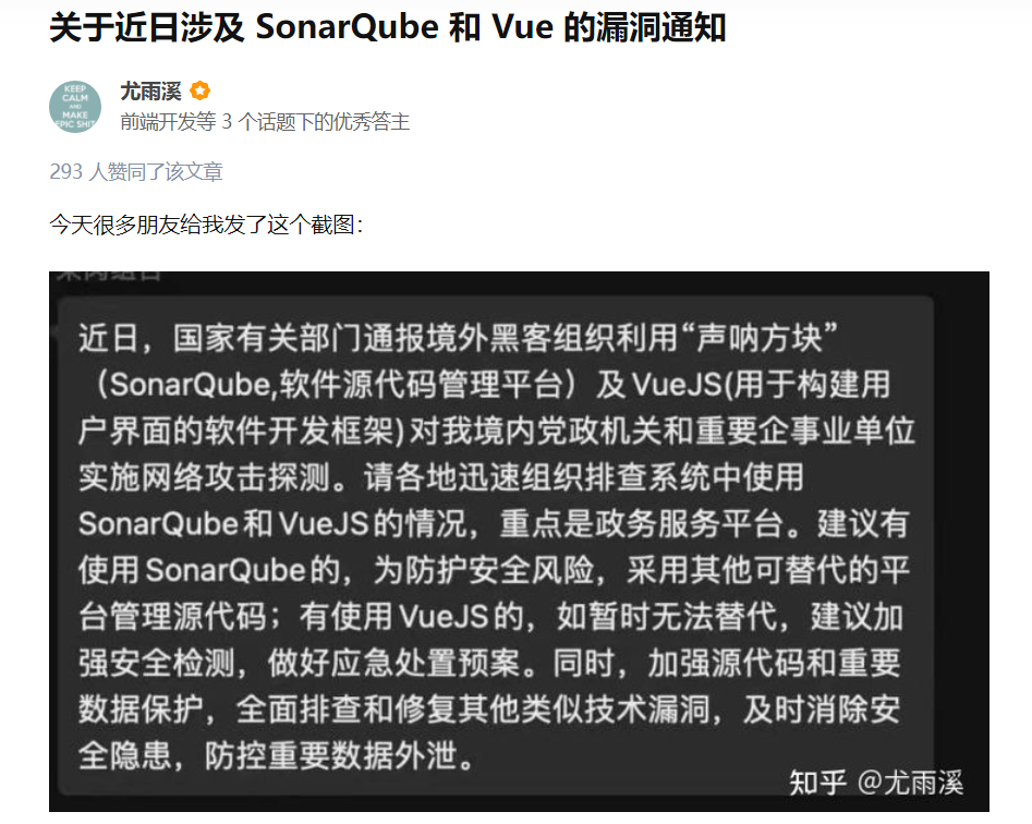 两张来源不明的截图今日在业内被广泛传播,其内容是国家有关部门要求境内党政机关和重要企事业单位对两款开源项目 SonarQube 和 Vue.js 的使用情况进行组织排查,重点是政府服务平台。原因是有关部门通报境外黑客正在组织利用 SonarQube 和 Vue.js 对上述单位实施网络攻击探测。