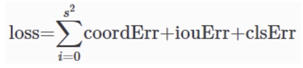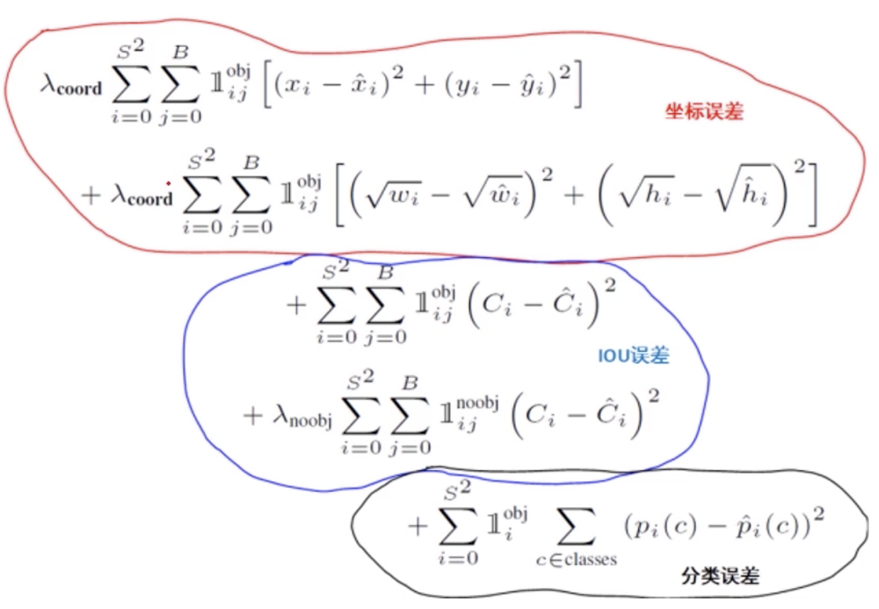 包含了三种Loss,坐标误差 、IoU误差和分类误差。这里每一种Loss也对应到了每一个网格所预测的信息对应的三种Loss。其中坐标误差对应到了S*S*(B*5+C)中的B,也就是Bounding box预测的信息之间的偏差。IoU的Loss对应到了坐标的误差。分类误差对应到了当前的格子所包含的groud true(gt,物体类别)所产生的误差。