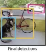 这样两幅图,对于第一幅图虽然每个格子预测了很多Bounding box,但是我们只选择IoU最高的Bounding box作为物体检测的输出。也就是说对于每个格子,我们最终只预测当中的一个物体,实际上这也是YOLO算法的一个缺陷。图像中可能会包含多个小的目标,此时由于每个格子只预测一个物体,如果一个格子同时出现多个物体的时候,对于小目标预测效果就会变得非常差。这也是YOLOV1算法主要的一个缺陷。通过NMS来进行Bounding box的合并、筛选和过滤之后,我们就能得到最终的检测结果。