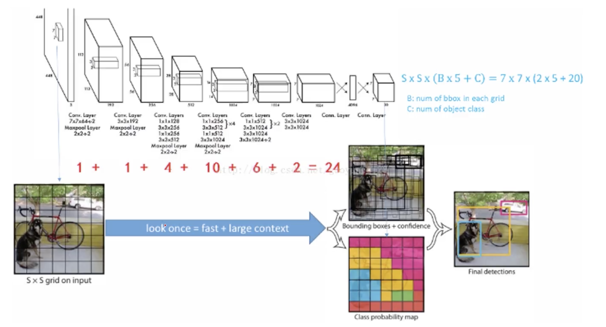 在实际使用的时候,每个格子都会预测B(超参值,通常为2)个检测框Bounding box及每个检测框的置信度(表明了当前的格子所包含物体的概率),对于每个检测框,要预测C个类别概率(含有待检测物体的可能性)。对于一个格子,它最终预测出来的向量的长度为5*B+C,这里5包含了每一个Bounding box的(x,y,w,h,c),c是置信度,而整个图所回归的向量长度为(5*B+C)*S*S。