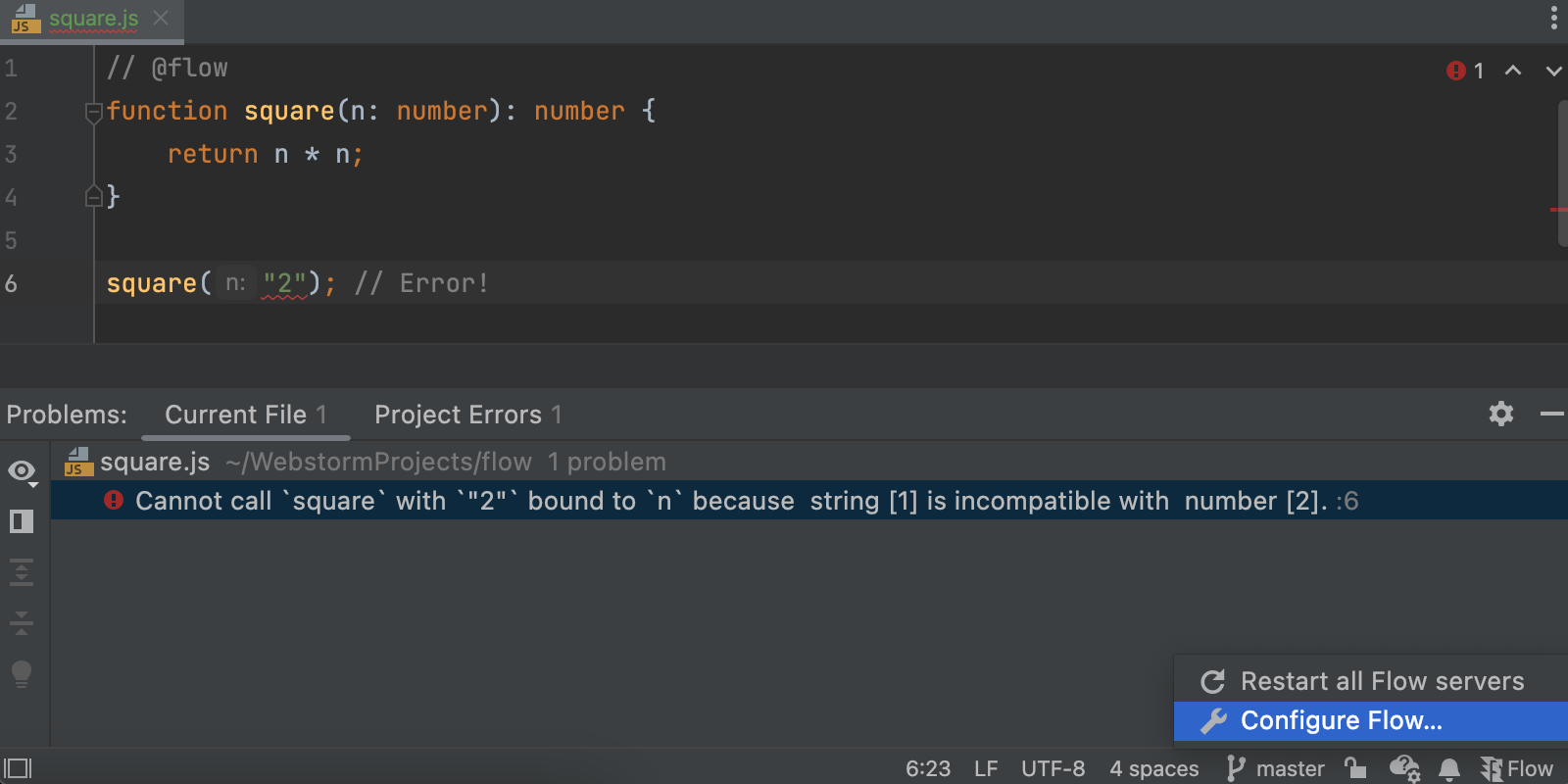 要访问以前在 Flow 工具窗口中可用的一些按钮,可以使用状态栏上的新 Flow 小部件。从那里可以重新启动 Flow 服务并跳转到配置设置。