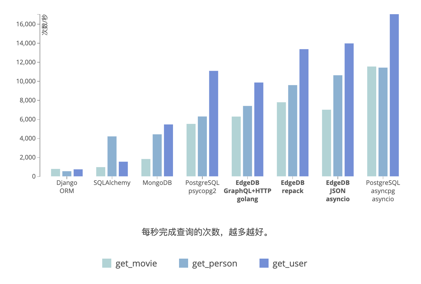 PostgreSQL 与 asyncpg 是最佳性能组合,给未来版本的 EdgeDB 提供了追赶的目标。但是要知道,asyncpg 是世界上最快的 PostgreSQL 驱动之一,并且日常工作中我们一般不会写出如测试中那般的查询语句。