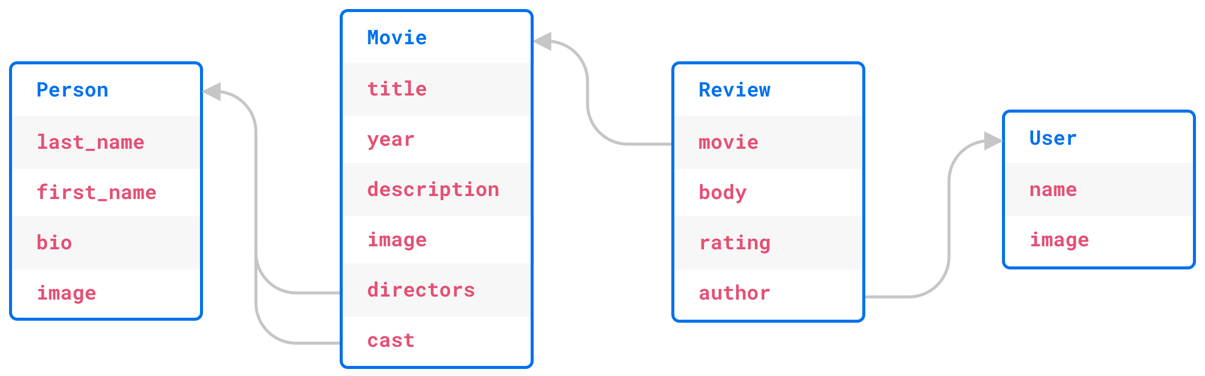 - 电影(Movie)页面展示电影名、发行年份、简介、海报图、导演和演员列表、总评分以及影评列表,每条影评(Review)又包括影评内容和评分,以及提交影评的用户的名字和头像。