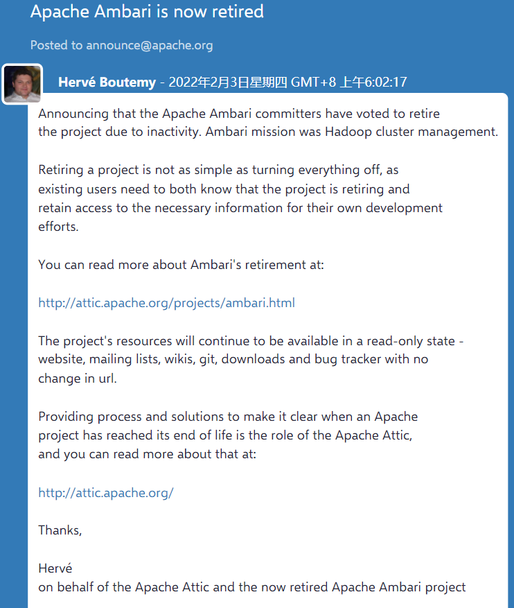 经历了投票以及完成退休流程后,Apache Ambari 近日正式官宣退休,它也成为了 Apache 软件基金会 2022 年首个正式退休的项目。