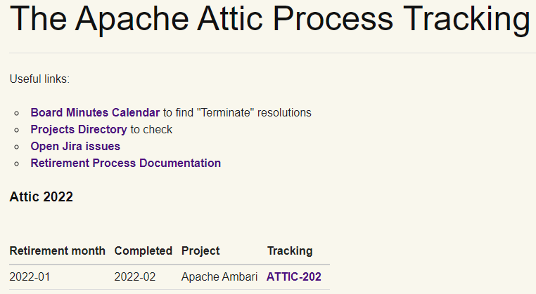 Apache Ambari 宣布退休的公告表示,项目退休并非简单地关闭一切东西,因为现有用户既需要知道该项目正在退休,又要保留获取必要信息以进行自身开发的机会。而这也正是 Apache Attic 存在的意义。