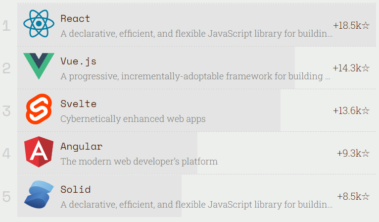 第五名的 Solid 是 React 的一个有趣的替代品。组件是用 JSX 编写的,但它不像 React 那样依赖虚拟 DOM。