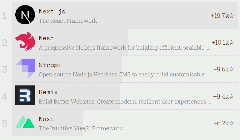 除了这些元框架,在第二位的 Nest 是更传统的服务器端 Node.js 框架的领导者,不与任何 UI 库相联系。