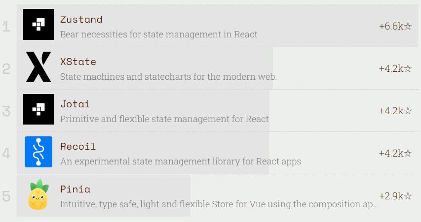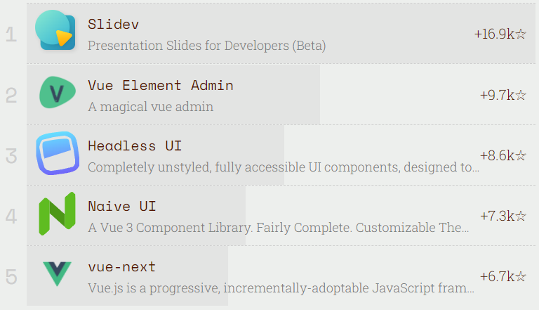 自我们开展 JavaScript Rising Stars 活动以来,React 首次成为头号 UI 框架,但如果我们考虑到 Vue.js 被分成了两个仓库(第二和第三版本),实际上 Vue.js 才是第一名。