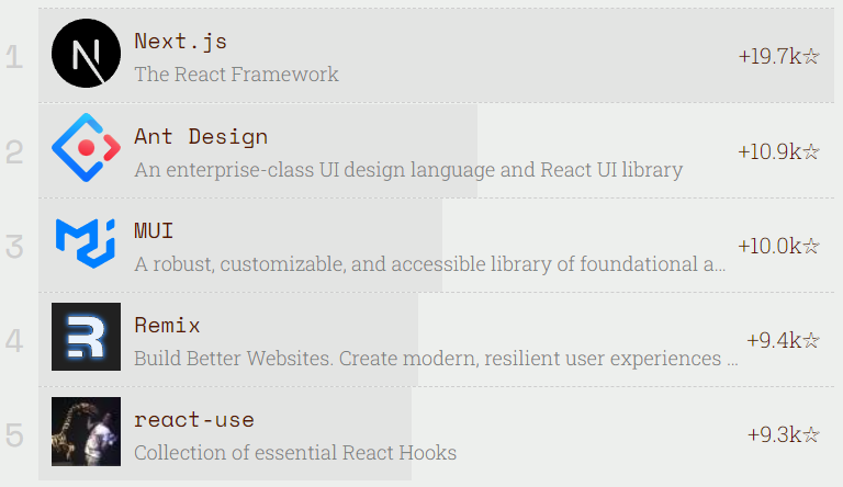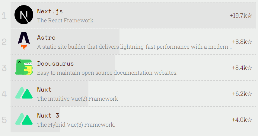 排在第三位的 Next.js 依旧保持了其在 React 世界中 “元框架” 的领先地位。