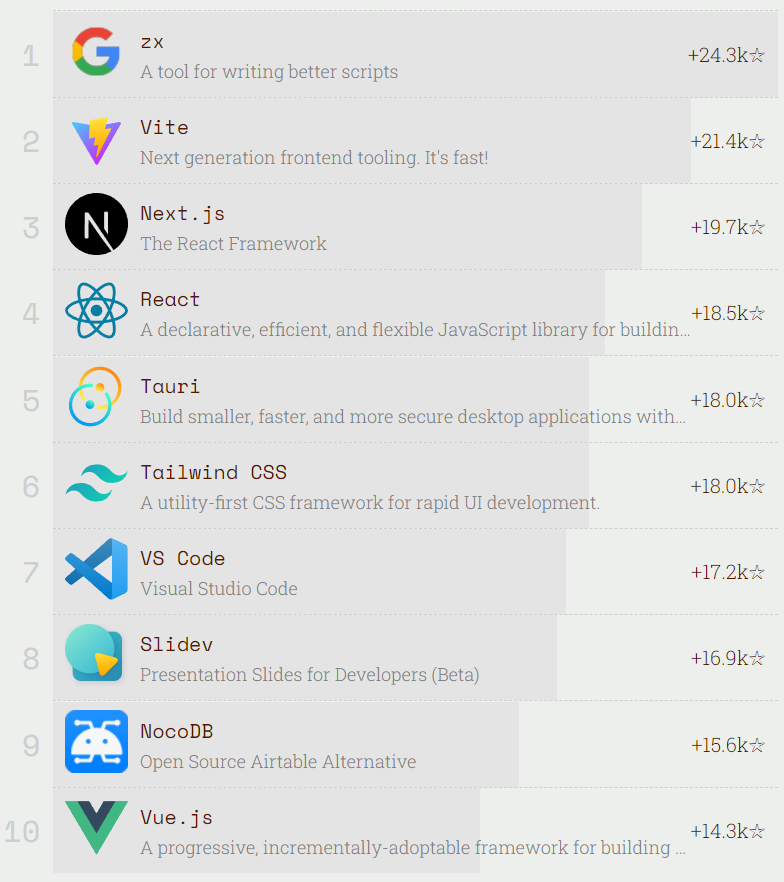 年度流行项目是 zx,一个由谷歌推出的全新的工具,可用于以 JavaScript 或 TypeScript 编写简单的命令行脚本。