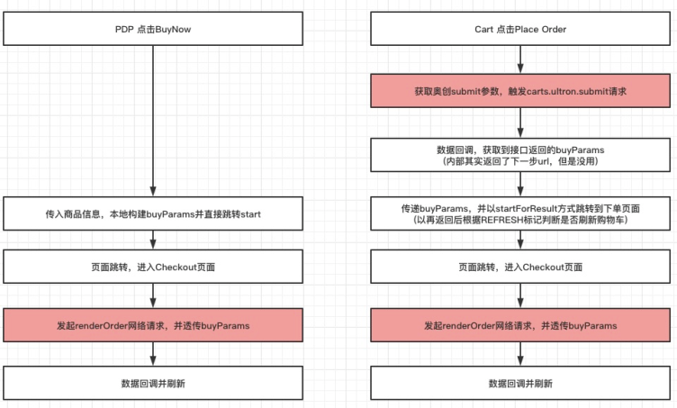 基于后置合并,我们协同服务端提供一个基于 mtop.lazada.carts.ultron.submit 和 mtop.lazada.buy.renderorder 的合并请求接口,在不修改原接口内部逻辑的基础上,服务端封装一个上层接口开放给端侧使用。请求的发起节点调整到进入下单页面,也就是点击下单按钮后直接进入下单页面&将Cart选中数据透传过去,并在下单页面进行请求;调整后,Cart.Submit承载的失败场景将直接挂在Checkout页面。