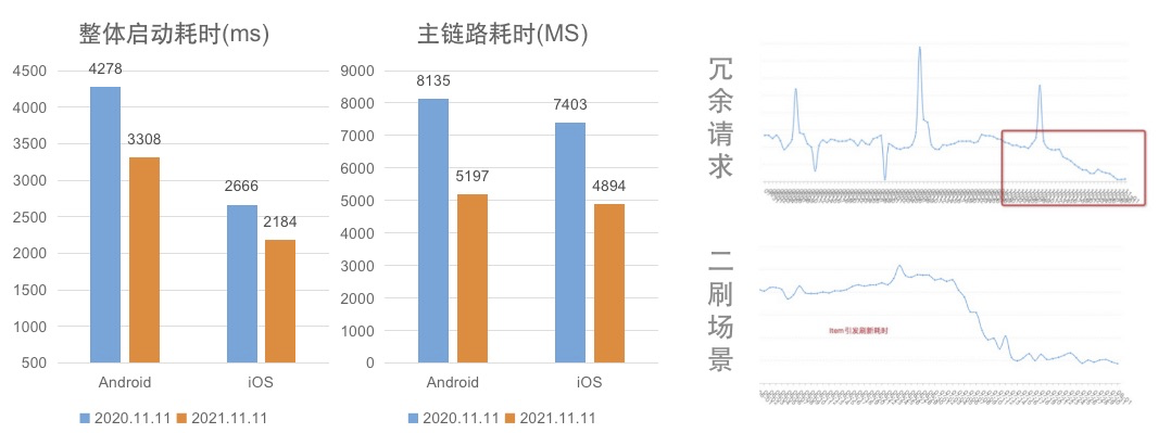 - 对于应用启动耗时:同比去年D11 Android启动整体耗时提升23%,iOS启动整体耗时提升20%;