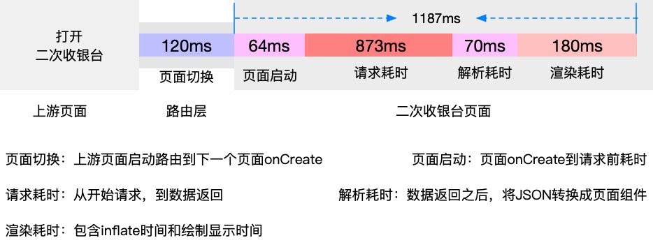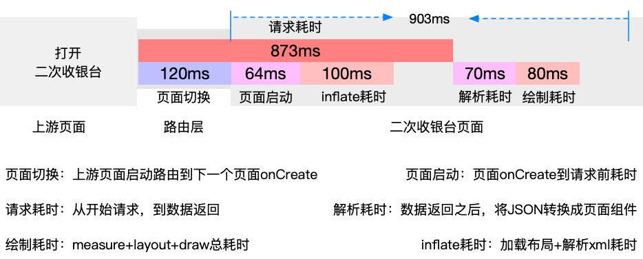 优化的核心思想:后事前移,串行改并行。mtop本身不依赖Activity,可以直接放到路由层去开始请求,同时我们渲染的流程实际上是包含了加载布局的时间(inflate)加绘制流程时间(即measure+layout+draw),通过本地自测可以看到收银台支付列表的一个布局,inflate一般会耗时20ms左右而一般需要5个这样的布局才能基本覆盖80%的页面大概耗时100ms(低端机可能会更多),那么这个渲染流程实际上也是可以提前加载的。