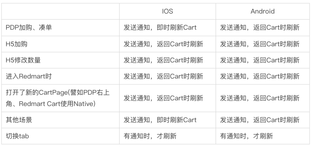 Android侧仅开放“重回购物车时刷新”,这是考虑到“大促场景下Android用户群体庞大,加购动作如果直接绑定Cart刷新行为可能引发流量压力”;同时,Android侧提供了“即时刷新购物车”的能力以便于特殊场景下的使用。