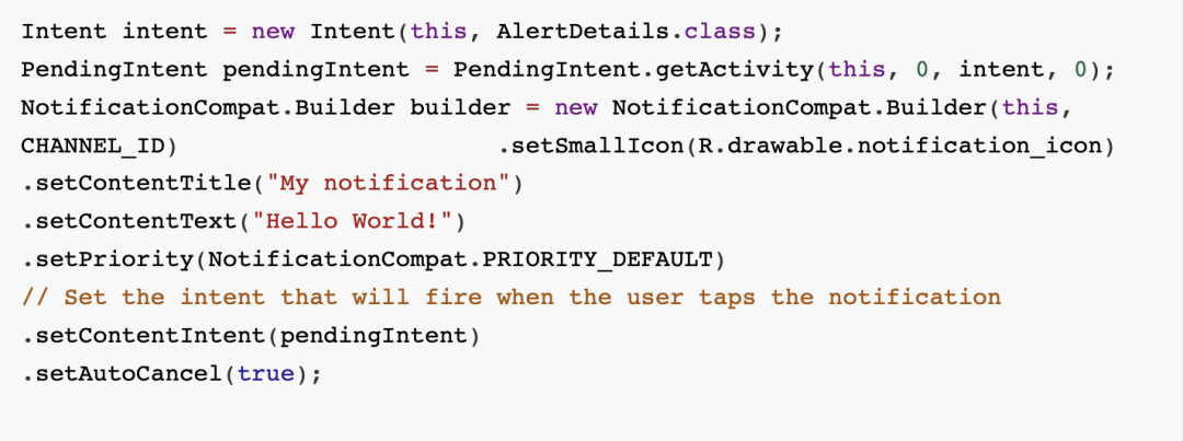 通知在Android系统中应用极为广泛,用于在状态栏中对用户进行提示,几乎为每个App所使用,是安卓开发者最常使用PendingIntent的地方,如下为发送通知的示例代码