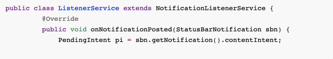 经过用户授权后,通知监听服务就可以获得通知对象,进而获得对象中的PendingIntent。如下,可以在onNotificationPosted回调函数中获取通知及其content Intent PendingIntent。