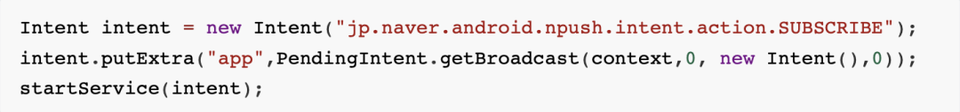 jp.naver.android.npush.intent.action.SUBSCRIBE 的服务,然后获取上面的PendingIntent,最后以LINE App的身份发送广播,造成伪造LINE App推送消息的危害。